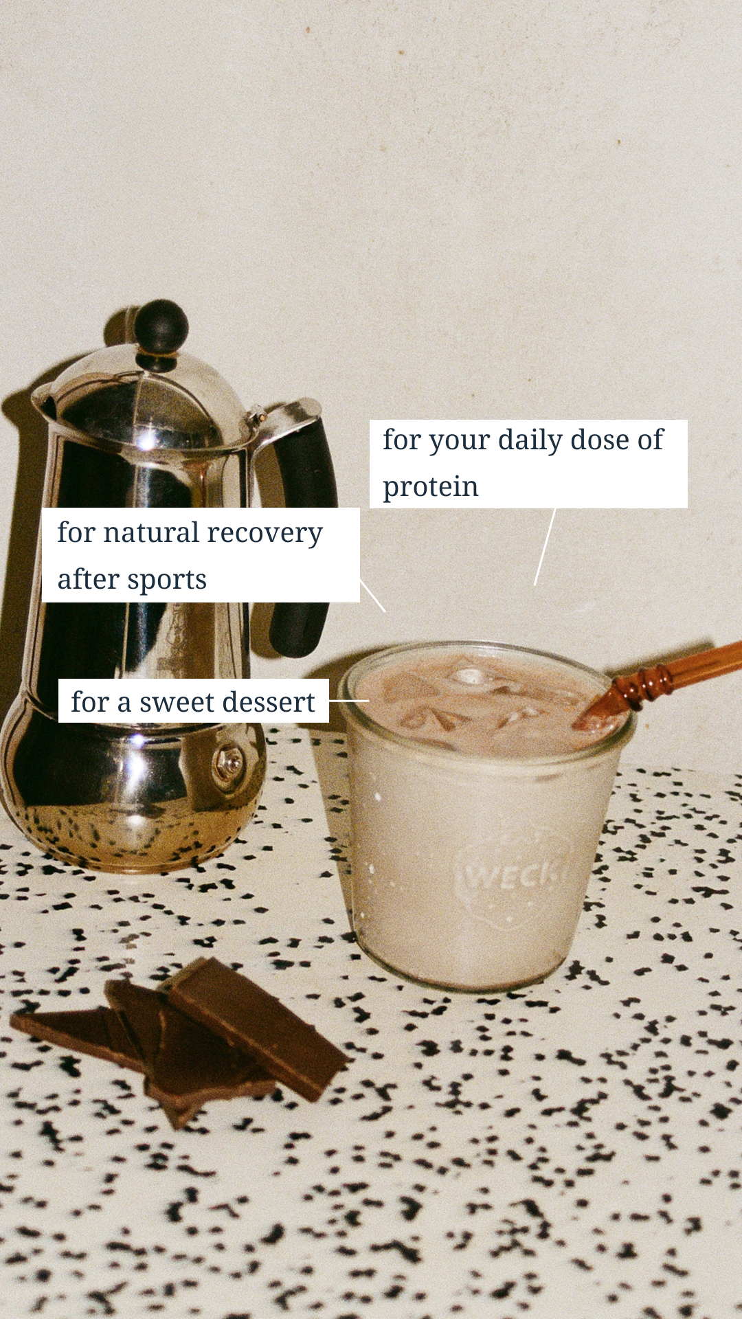 A rich, dark chocolate-flavored, plant-based protein blend, enriched with minerals, adaptogens, and matcha – designed for natural post-sport recovery, muscle growth, and immunity.