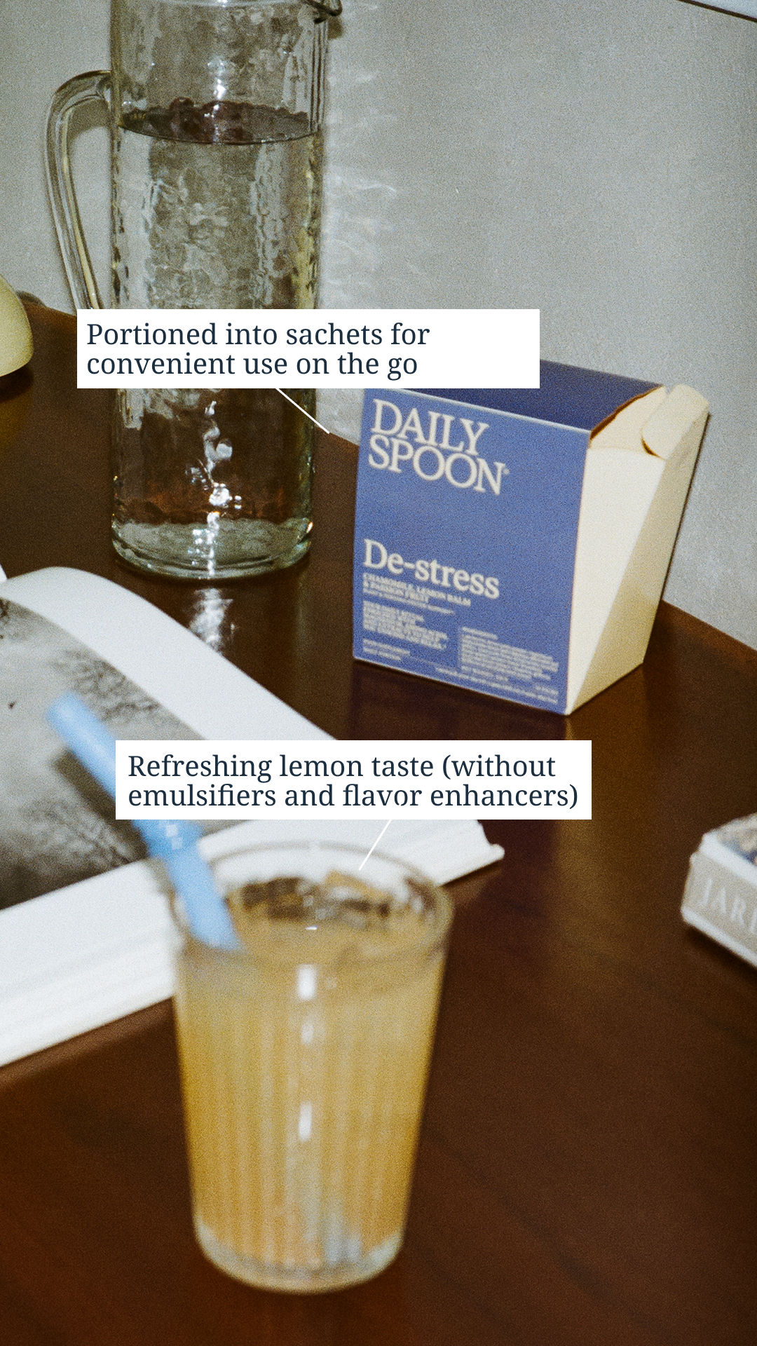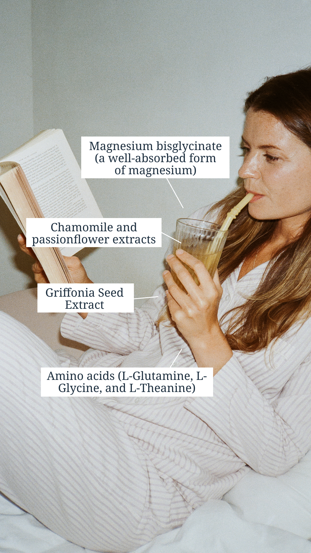 L-glutamine, lemon juice powder, magnesium bisglycinate, chamomile flower (Chamomilla recutita) extract, passion flower (Passiflora incarnata) extract, L-theanine, griffonia (Griffonia simplicifolia) seed extract.
