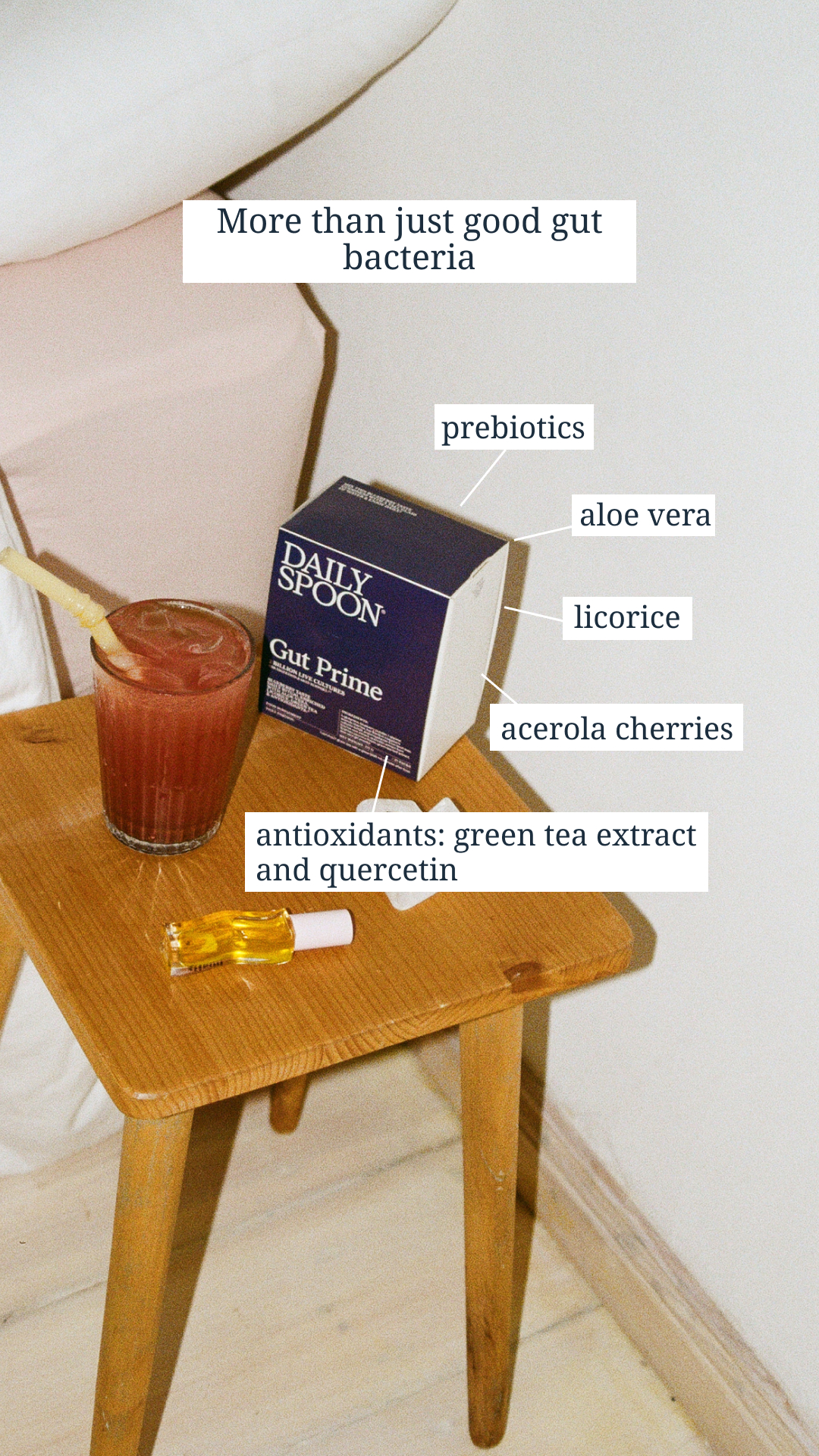 Crafted with the expertise of a PhD in biochemistry, Gut Prime is made with only the highest quality ingredients, carefully selected to support a thriving gut microbiota. While this ritual can make a big difference, true wellbeing also depends on a balanced diet, quality sleep, and stress management.