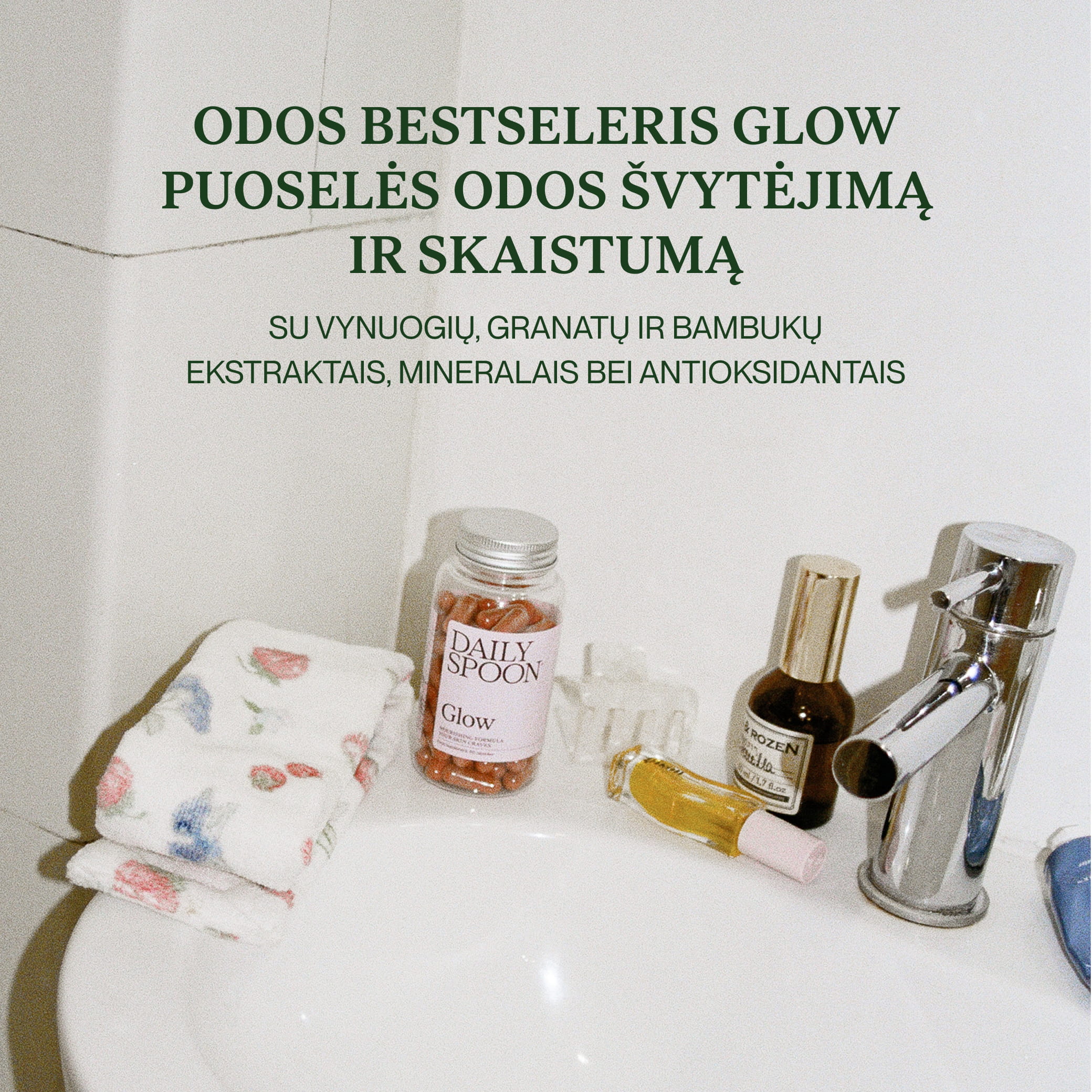 An important role is also played by the Glow dietary supplement, rich in grape, pomegranate, and bamboo extracts, as well as minerals and antioxidants that focus specifically on supporting the skin and enhancing its natural radiance.
