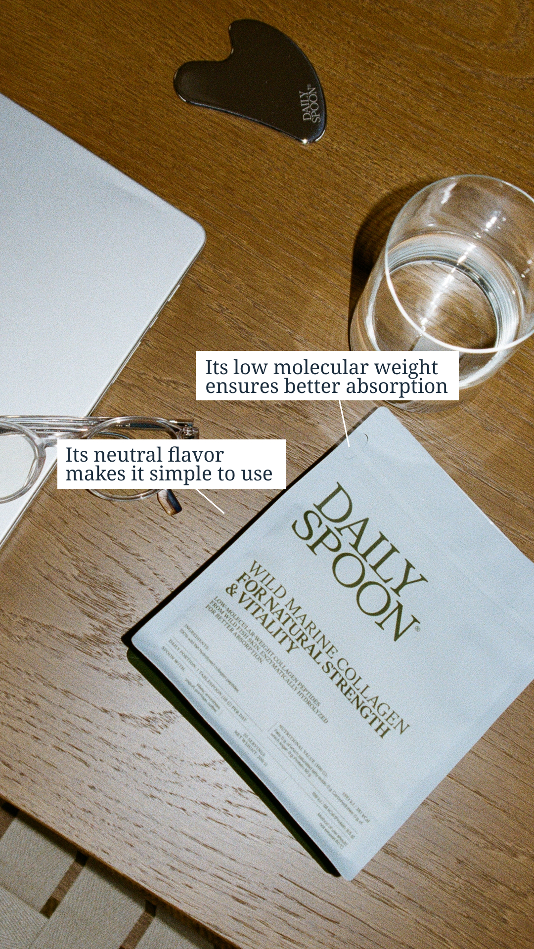 Hydrolyzed wild marine collagen – low molecular weight for better absorption and neutral taste for easy use.