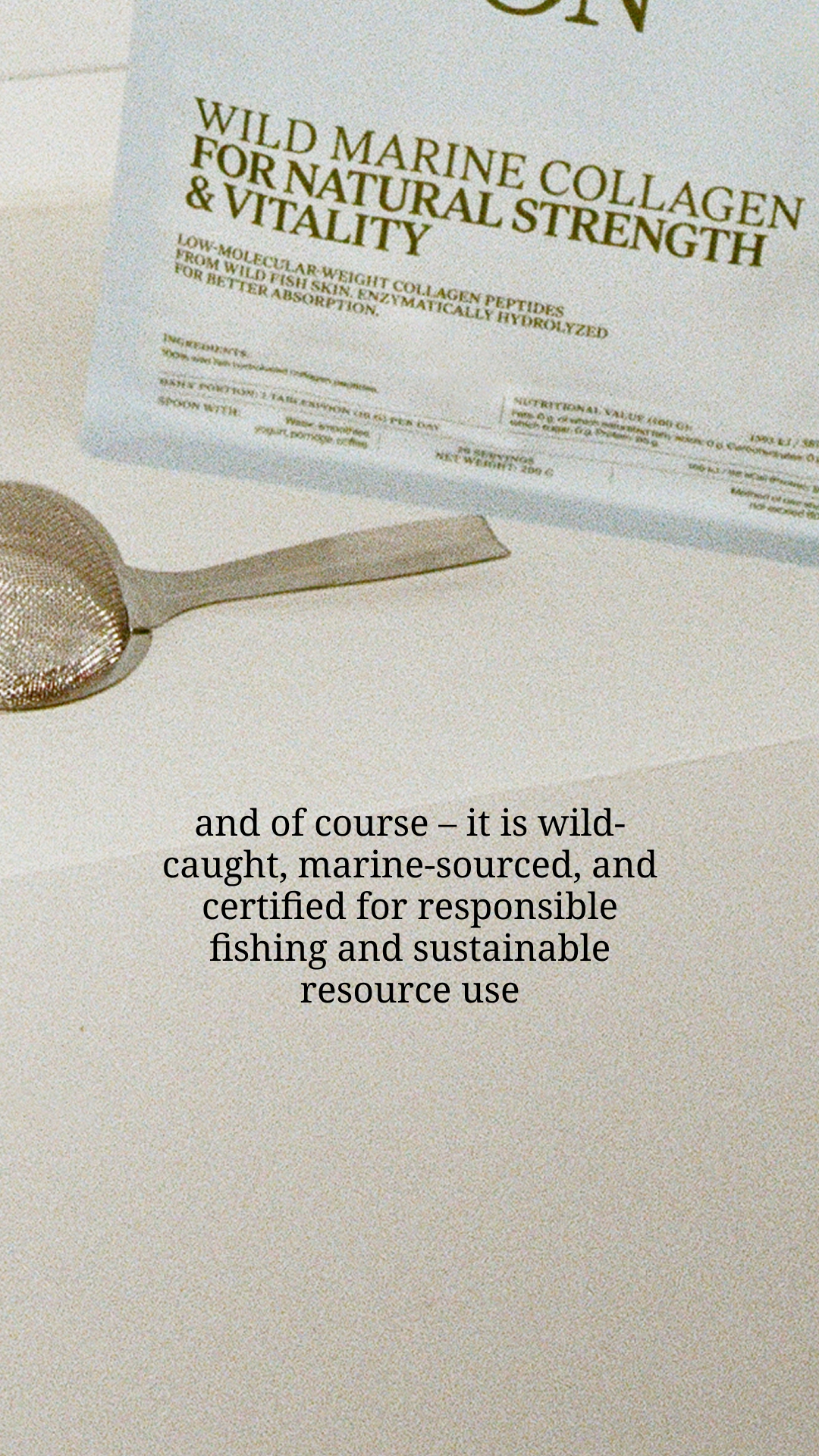 From wild-caught fish - we ensured our collagen is sourced from fish that grow naturally, without added feed, hormones, or antibiotics. It is certified by Friend of the Sea and the MSC (Marine Stewardship Council), both guaranteeing responsible fishing and sustainable resource use.
