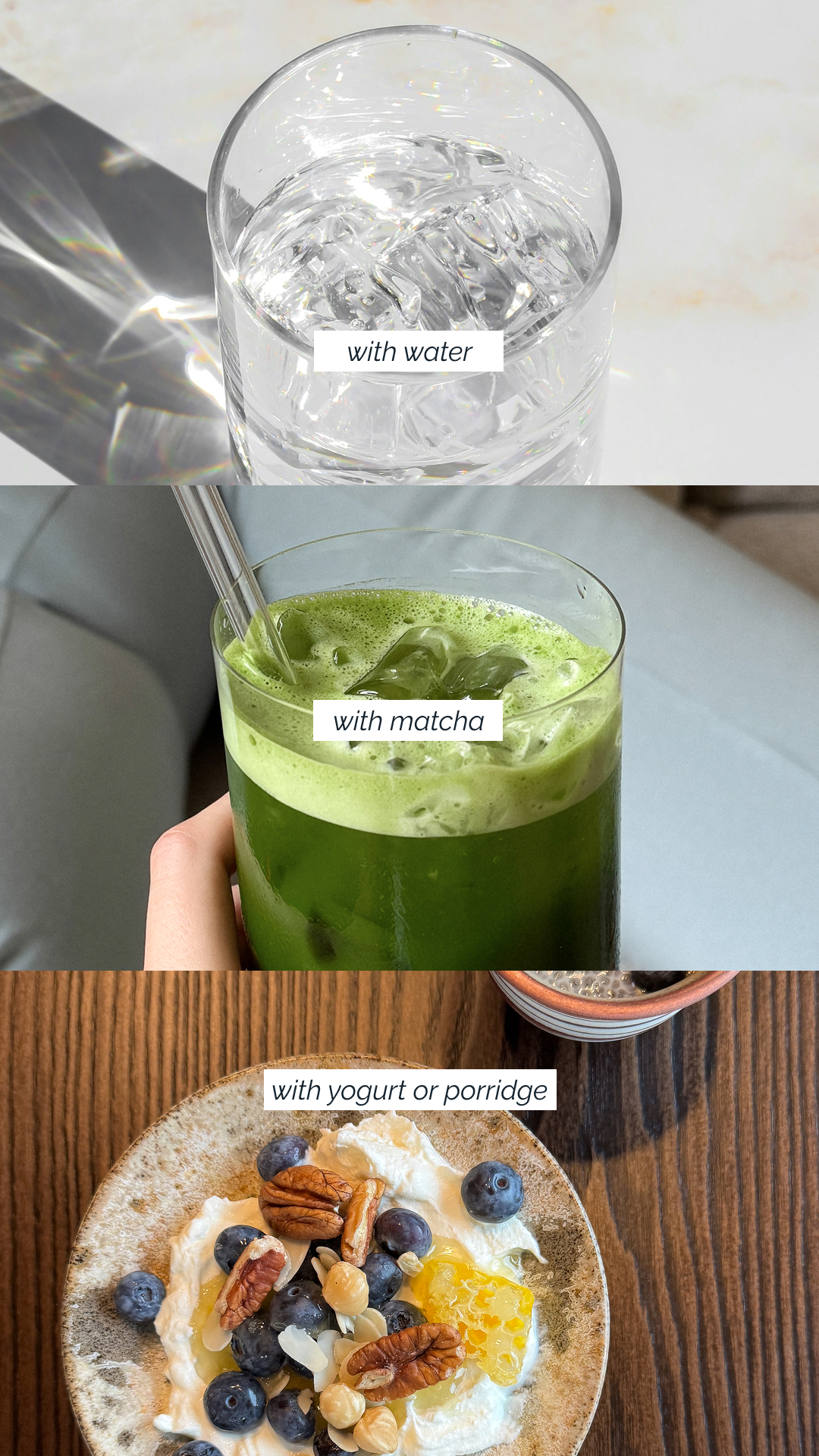 Neutral taste and smell - we made sure this collagen is easy to use. It’s a truly versatile ritual, since you can enjoy it simply with water, mix it into coffee or matcha, or add it to smoothies, porridge, or yogurt - it blends seamlessly anywhere.