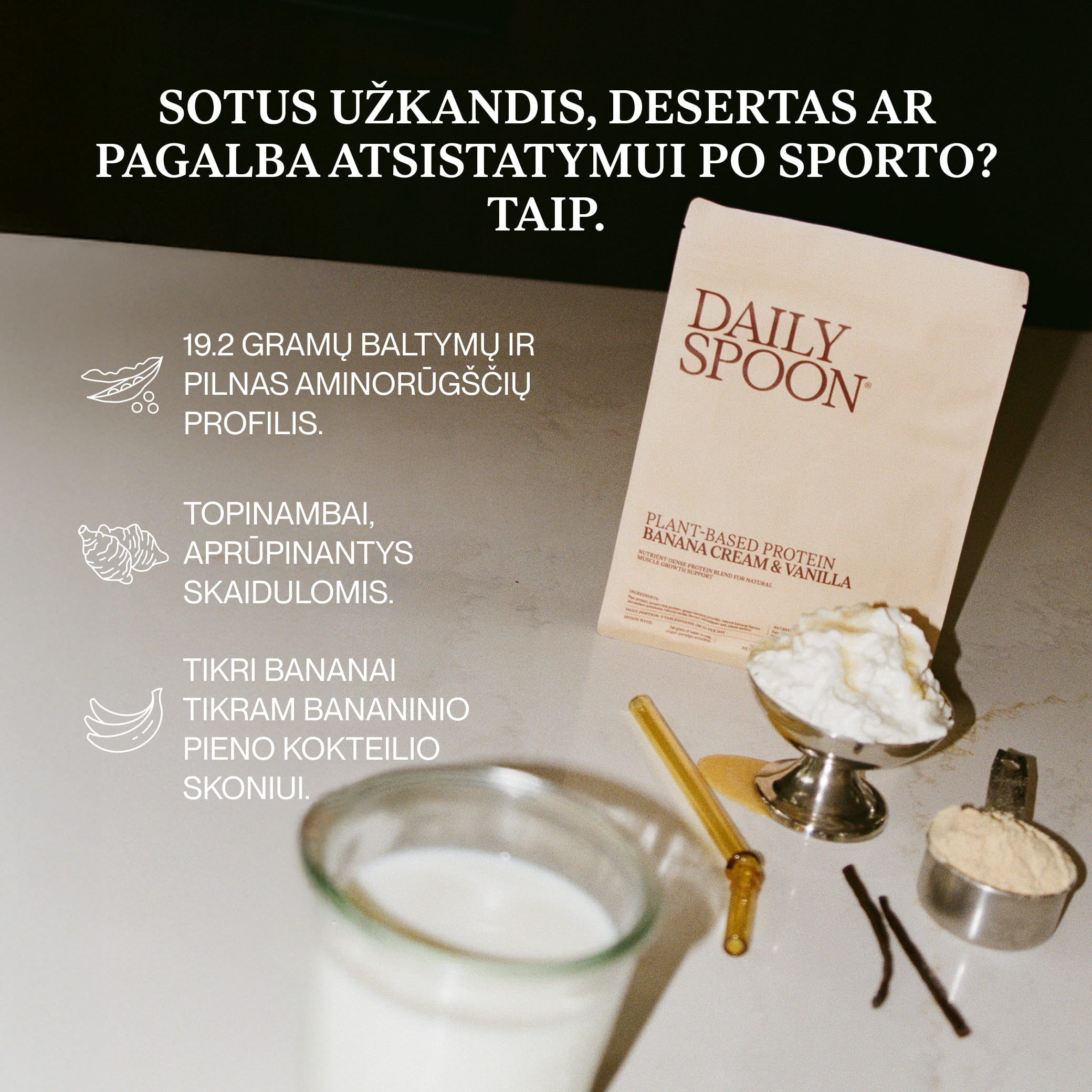 Rezultatas – augaliniai baltymų milteliai, kurie yra kremiški, natūralūs ir tinka net jautresniam virškinimui.