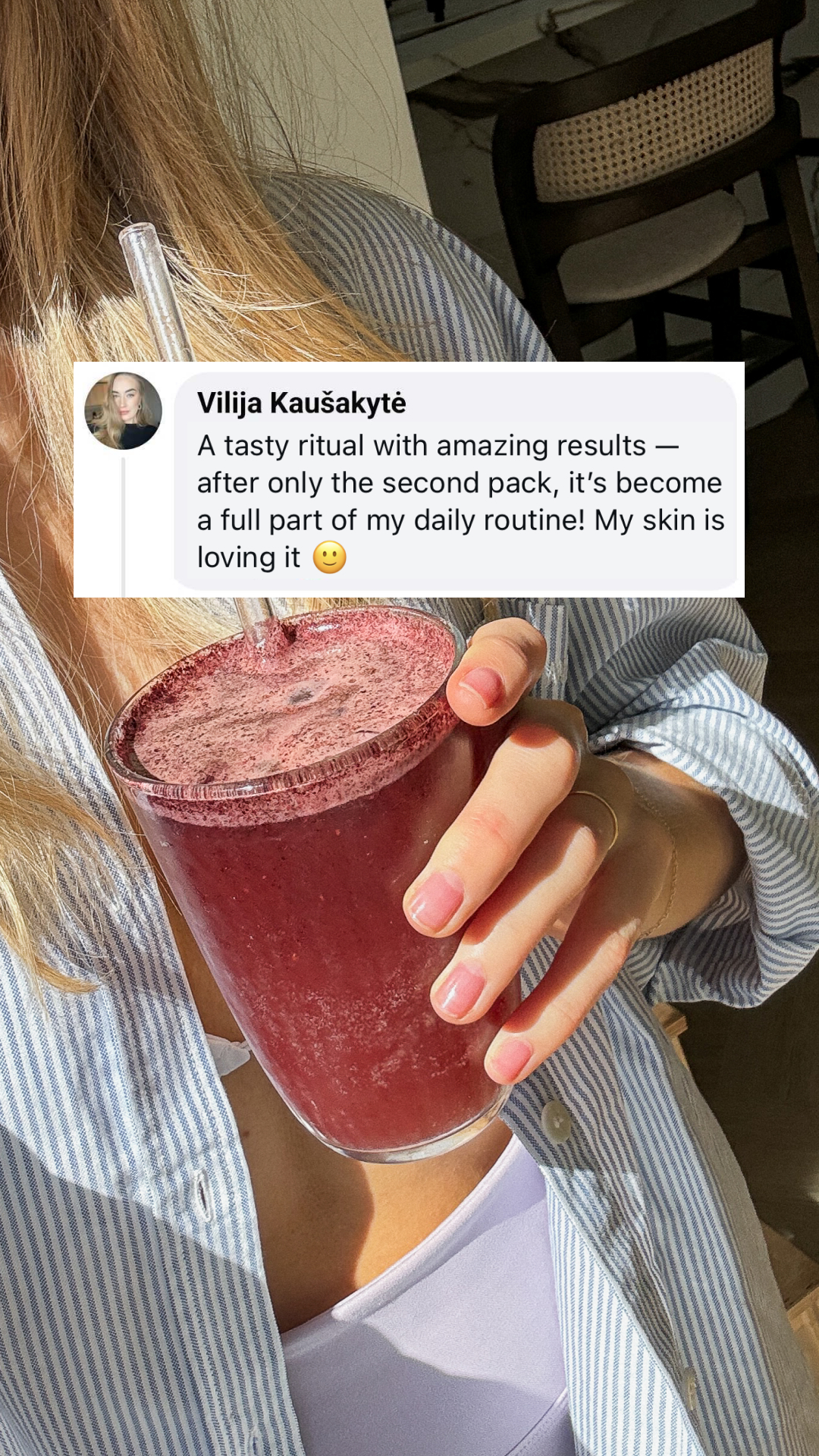 Galiausiai, žarnynui reikalingas skaidulas jis gaus iš liofilizuotų mėlynių, kaip ir gaivų ritualo skonį be jokių saldiklių ir emulsiklių.