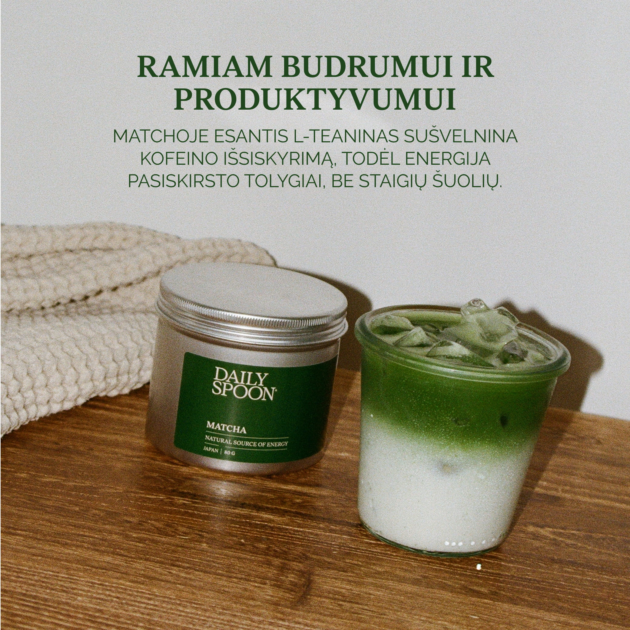 Matcha ne tik aprūpins tolygia energija be staigių kritimų, bet joje esantis L-teaninas leis lengviau susikaupti ir atlikti dienos darbus. Ji atvykusi iš matchos ūkio Japonijoje, kur arbatos auginimo tradicijos tęsiamos šimtmečius, todėl mūsiškė – ryškios spalvos, sodraus aromato ir švelnaus skonio.