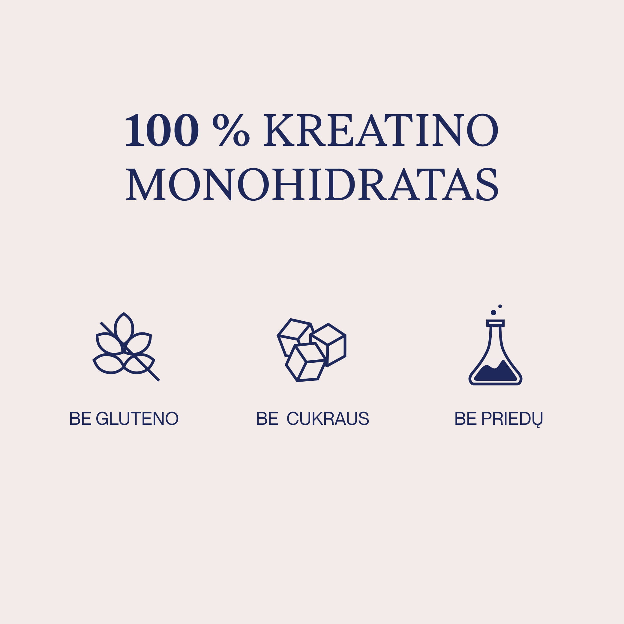Be to, mūsiškis yra mikronizuotas – tai reiškia, kad milteliai pasižymi labai smulkia tekstūra ir geru tirpumu, todėl lengvai įsimaišo į vandenį ar kitus gėrimus. Sudėtis išlieka visiškai minimalistinė – tik 100% kreatino monohidratas, be jokių priedų, kvapiklių ar saldiklių.
