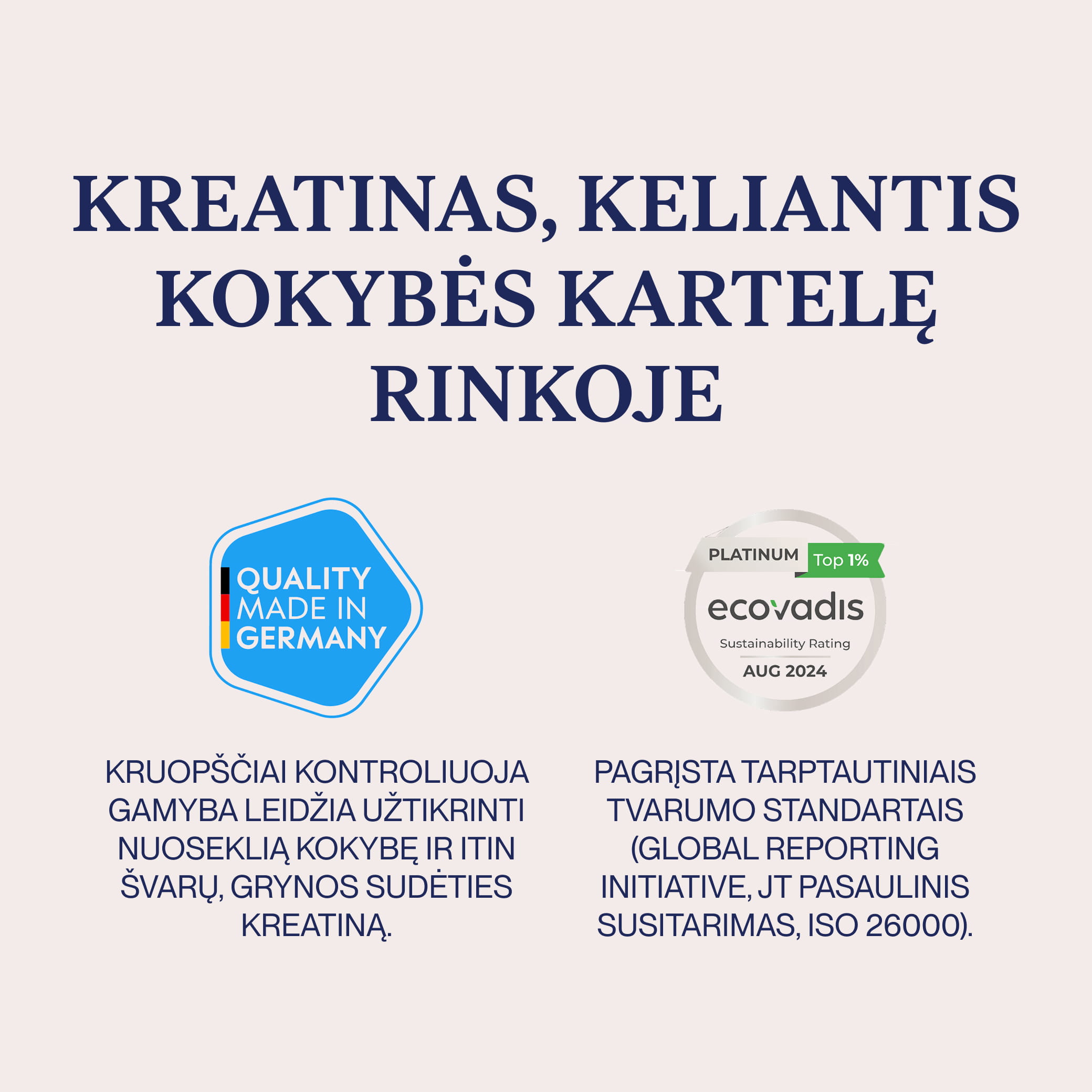 Kreatinas yra natūrali medžiaga, dalyvaujanti energijos gamyboje. Jis ypač svarbus trumpų, intensyvių fizinių pastangų metu – nuo treniruotės sporto salėje iki aktyvaus gyvenimo ritmo.