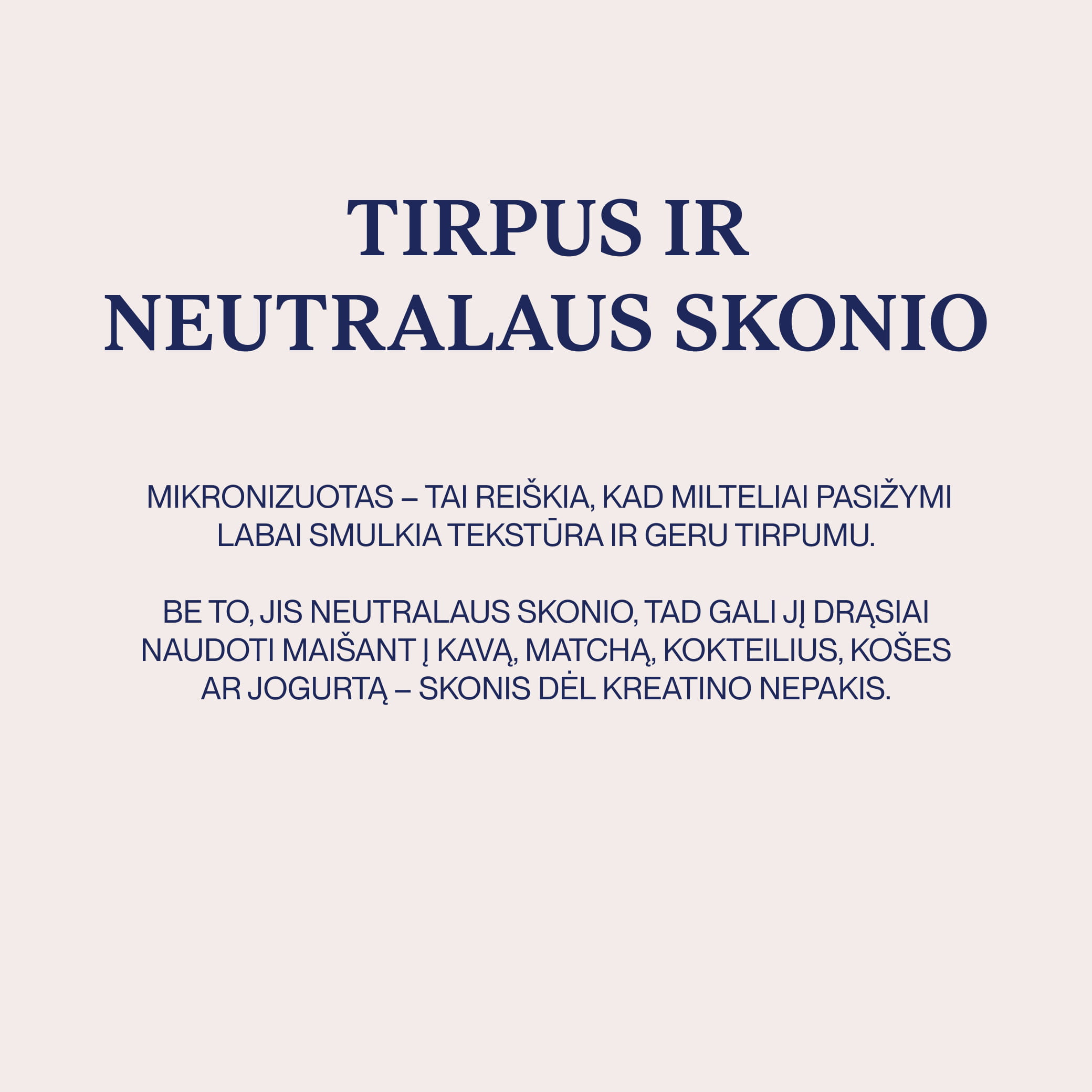 Kartu pasirūpinome, kad kreatiną būtų paprasta įtraukti į savo rutiną, todėl šis neturi jokio skonio bei yra mikronizuotas, todėl pasižymintis puikiu tirpumu. Tai leidžia jį drąsiai gerti tiesiog su vandeniu, maišyti į kavą ar matchą, praturtinti vaisių kokteilius, košes ar jogurtus – jį tikrai galima naudoti visur.