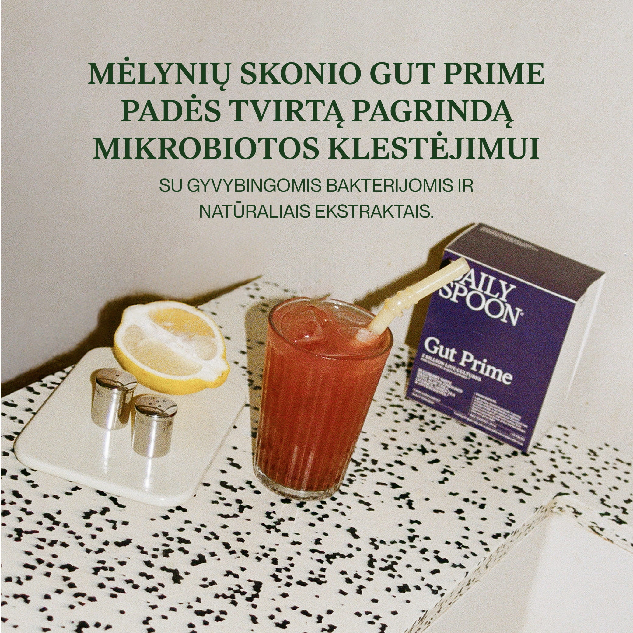Mėlynių skonio maisto papildas Gut prime padės tvirtą pagrindą mikrobiotos klestėjimui. Jame esantys aktyvesni ingredientai, kaip gyvosios bakterijos ir ekstraktai, puoselės žarnyną ir tuo pačiu odos švytėjimą.